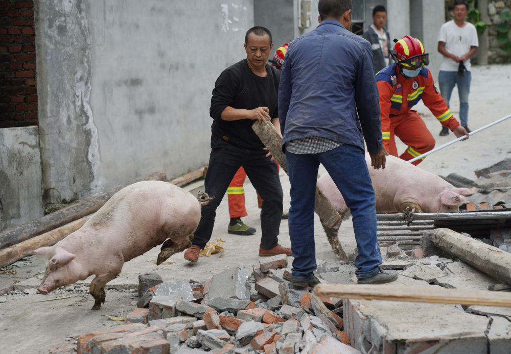 9月7日,在幸福村二組,消防救援隊(duì)員協(xié)助村民從倒塌的豬圈中轉(zhuǎn)移豬。