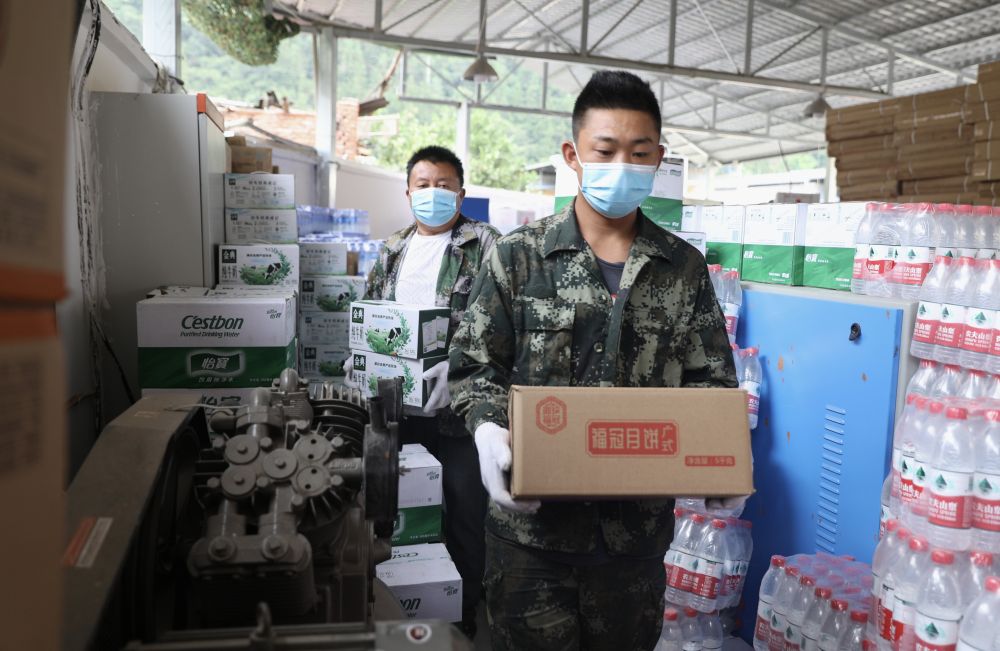 9月7日,在幸福村二組,村民與消防救援隊(duì)員搬運(yùn)直升機(jī)送來(lái)的水和食物。