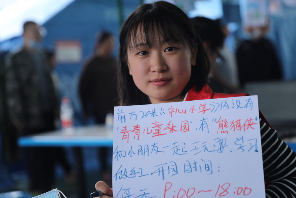 看到我手里的照相機(jī),他們十分好奇。一位叫駱雅萱的小朋友拉了拉我的衣角說(shuō):“姐姐,我想用你的相機(jī)給‘熊貓俠’拍一張照片好嗎?”“熊貓俠”是這里的一名志愿者,地震發(fā)生以來(lái)一直在安置點(diǎn)陪伴著小朋友們,大家都很喜歡她。我答應(yīng)了小朋友的請(qǐng)求,教她按下快門(mén),看到自己拍的照片,她開(kāi)心地給“熊貓俠”展示。