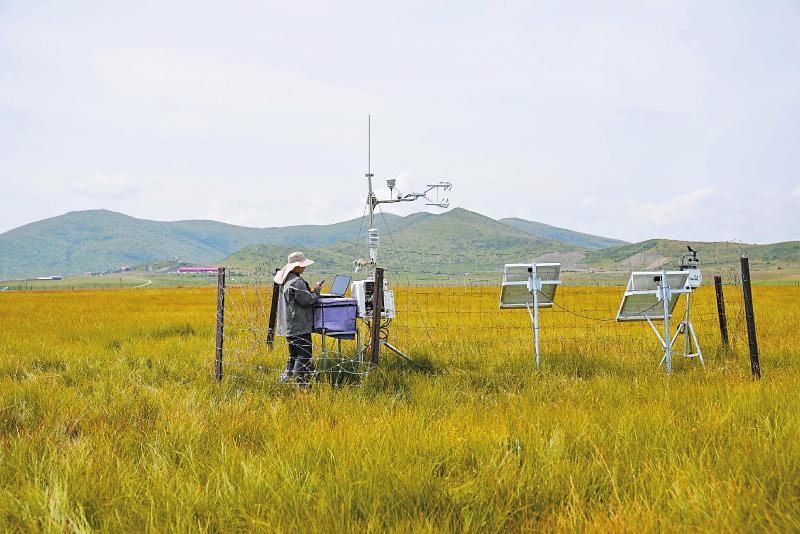 四川若爾蓋高寒濕地生態(tài)系統(tǒng)國(guó)家野外科學(xué)觀測(cè)研究站高寒濕地綜合觀測(cè)場(chǎng)內(nèi),工作人員正在下載數(shù)據(jù)。