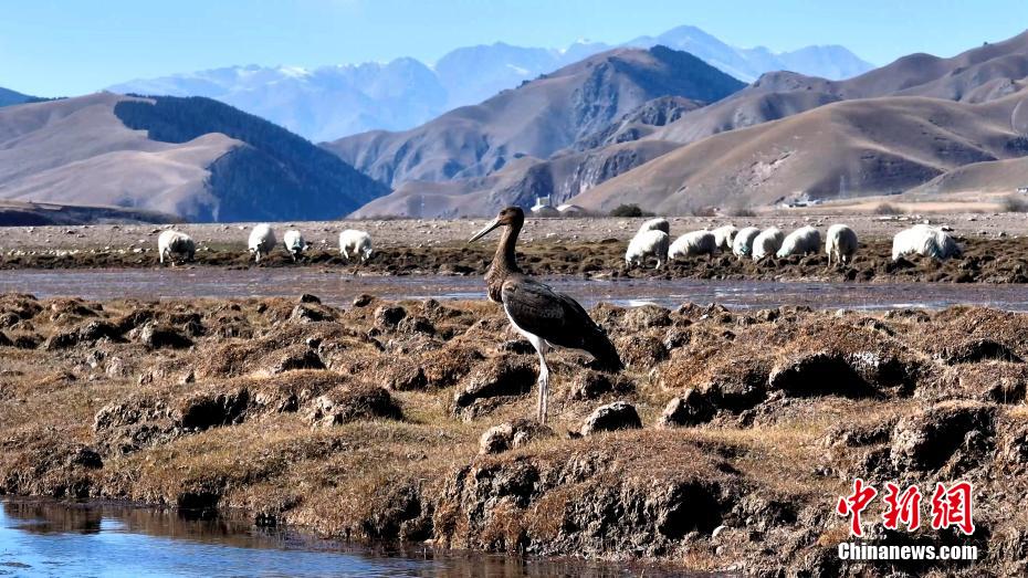 高原深秋,在祁連山國(guó)家公園青海片區(qū)的祁連縣阿柔鄉(xiāng)的一片沼澤地,攝影師拍到了一只成年黑鸛。畫面中,黑鸛在祁連縣阿柔鄉(xiāng)的一片沼澤地里覓食休憩,時(shí)而在羊群牛群中飛翔穿梭,仿佛在幫牧人“放牧”。包雷 攝
