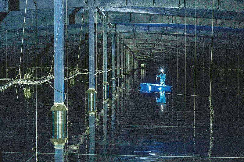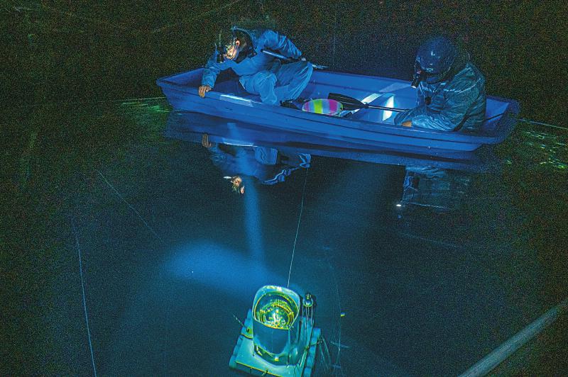 24日,陳明君和同事穿上潔凈服、戴上腳套,劃著小船進入伸手不見五指的三號水池,他們要逐一檢查維護這里的探測器單元和電子學箱。船劃到指定位置,黑暗中陳明君的頭燈光束直射水底,水下碩大的探測器單元核心設備——光電倍增管,被照得清晰可見,他和同事一起用“鉤子”把光電倍增管拉起,進行檢查。“水池里的深度是4.5米,這些純凈水的透明度比自來水高三倍以上,切倫科夫光就從里面捕獲?!标惷骶嬖V記者。