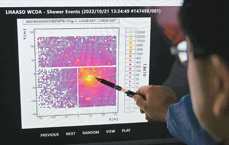 10月21日,科研人員在電腦上展示探測器的時間切片,片中顯示的帶顏色的光點,顏色越明亮,表明射線能量越強。