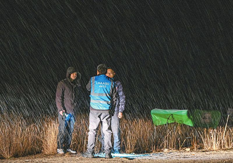 10月24日晚,拉索迎來了今秋的第一場大雪,走出水切倫科夫探測器的陳明君(中)與團隊工作人員討論需要解決的問題。