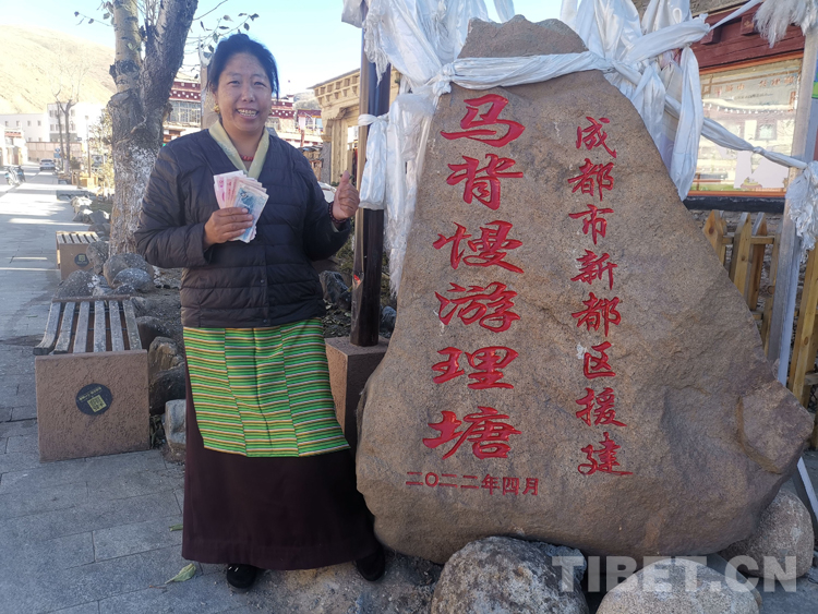 圖為四郎卓瑪在現(xiàn)金分紅后在項(xiàng)目石刻前留影