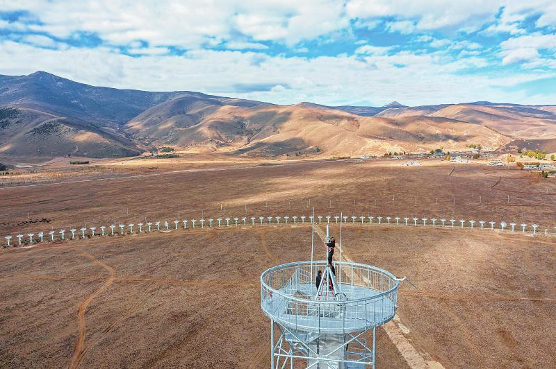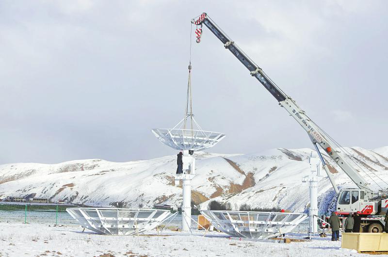 2022年11月13日 工人正在安裝圓環(huán)陣太陽射電成像望遠鏡設備的最后一個天線面。