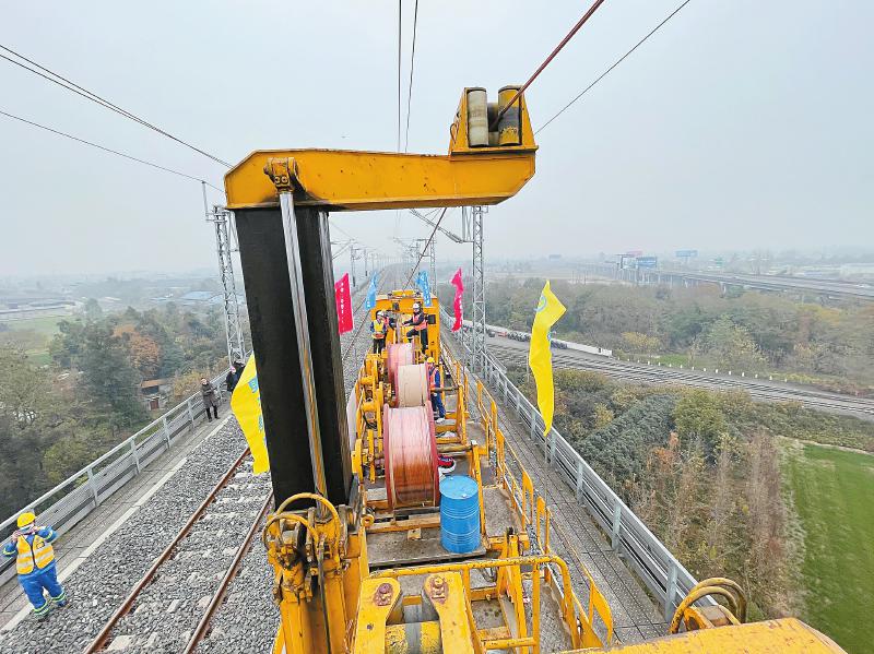 1月8日,成蘭鐵路成川段首條接觸線成功架設(shè)。