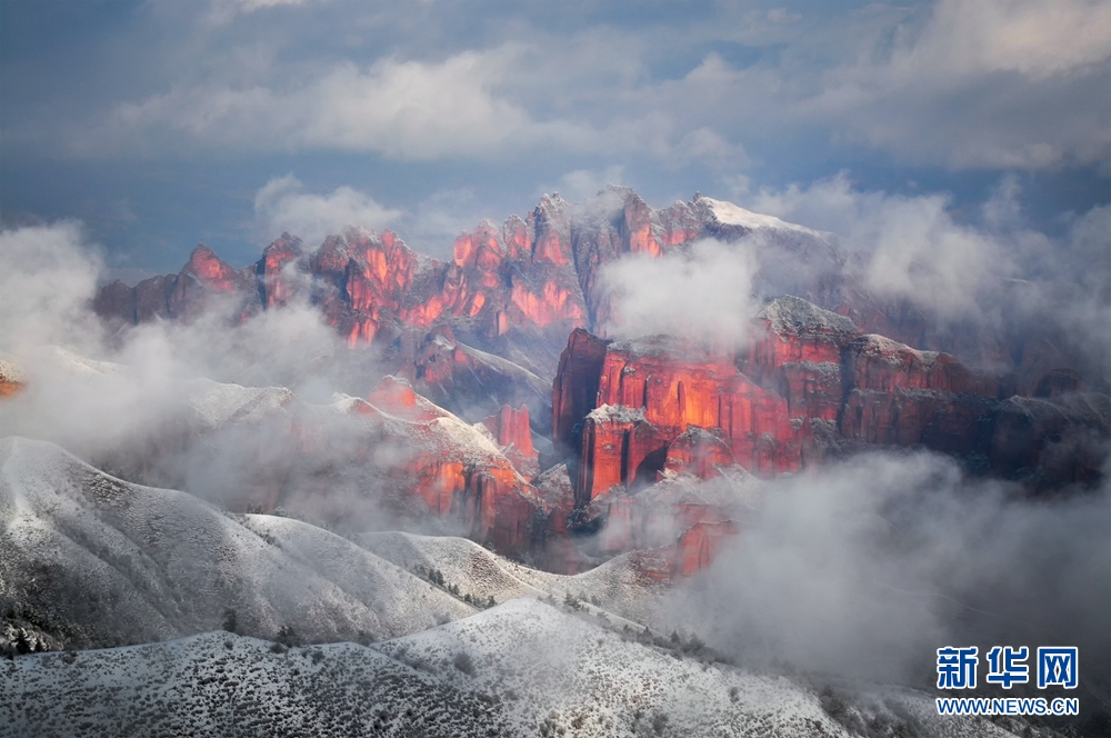 赤紅色的丹霞地貌與皚皚白雪相映成景,美不勝收。新華網(wǎng) 李河清 攝