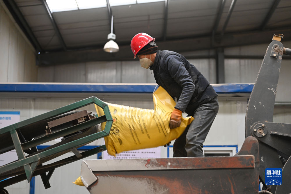 1月12日,青海省剛察縣一家飼料生產(chǎn)企業(yè),工作人員在搬運(yùn)成品飼料。新華社記者 張龍 攝