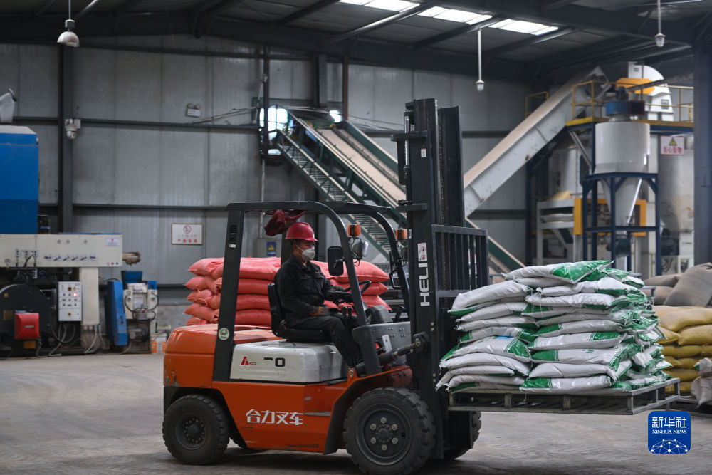1月12日,青海省剛察縣一家飼料生產(chǎn)企業(yè),工人使用叉車搬運(yùn)成品飼料。新華社記者 張龍 攝