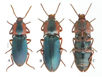 2022年6月17日,綿陽(yáng)師范學(xué)院團(tuán)隊(duì)來(lái)到四川省阿壩藏族羌族自治州黑水縣,開(kāi)展草原有害生物普查工作。當(dāng)天下午6點(diǎn)過(guò),他們到達(dá)了黑水縣,在蘆花鎮(zhèn)四美村的一條土路旁,一只長(zhǎng)相新奇的甲蟲(chóng)引起了許浩的注意?!八l(fā)現(xiàn)后趕緊叫住我,甲蟲(chóng)呈現(xiàn)金屬藍(lán)色光澤,在其前胸背板的兩側(cè),都有紅色斑紋,長(zhǎng)得特別好看。”邱鷺說(shuō),“當(dāng)時(shí)初步判斷是一個(gè)金叩甲的物種,但以前從來(lái)沒(méi)見(jiàn)過(guò)?!?/p>