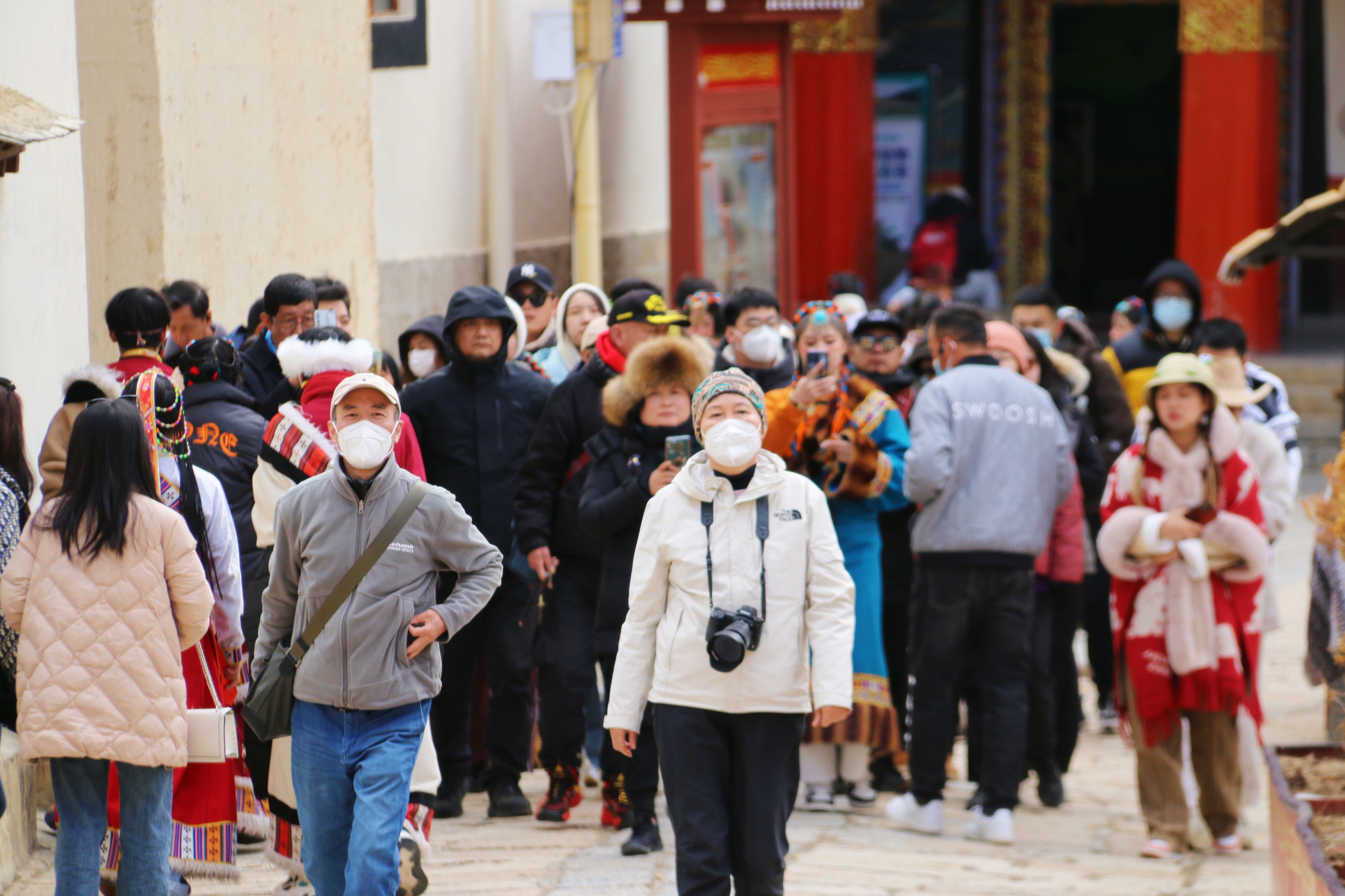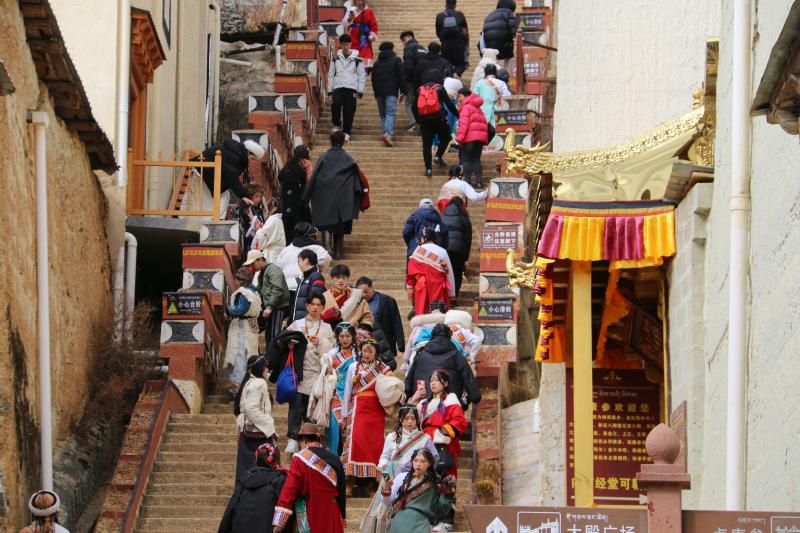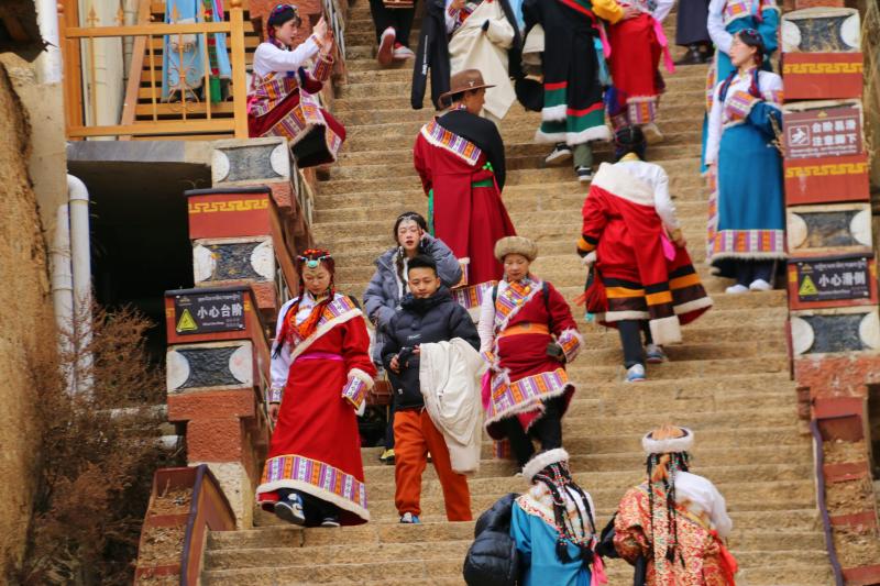 近日,香格里拉旅游持續(xù)升溫,松贊林景區(qū)游人如織,游客們紛紛身著民族服飾與景點(diǎn)合影留念。
