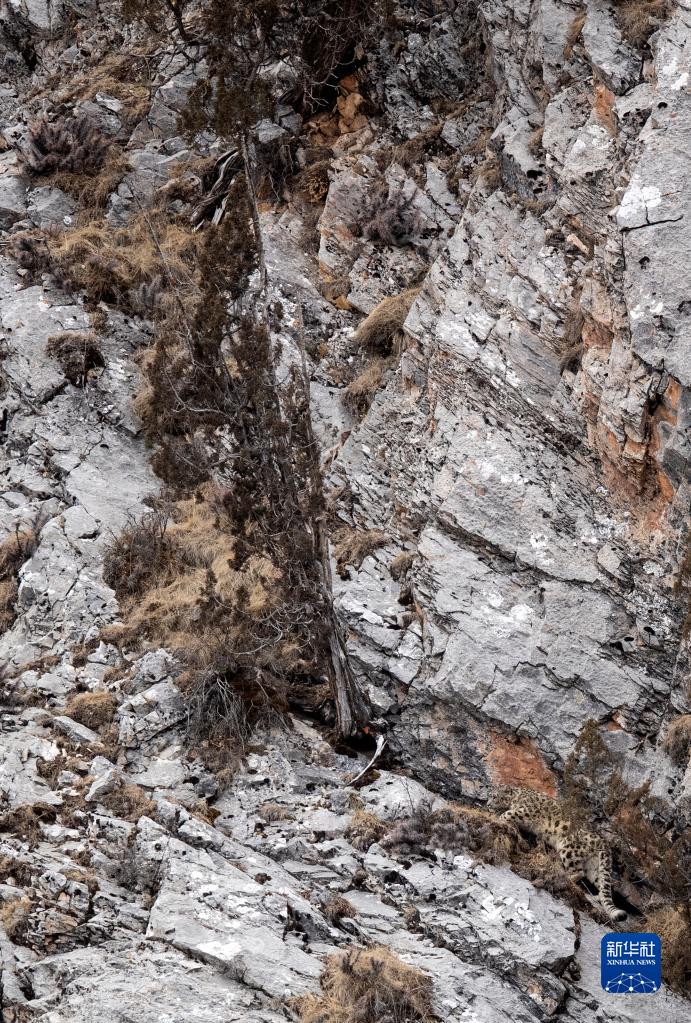2月21日,在青海省玉樹藏族自治州雜多縣昂賽鄉(xiāng)境內(nèi)的昂賽大峽谷內(nèi),一只雪豹在向上攀爬。新華社記者 費茂華 攝