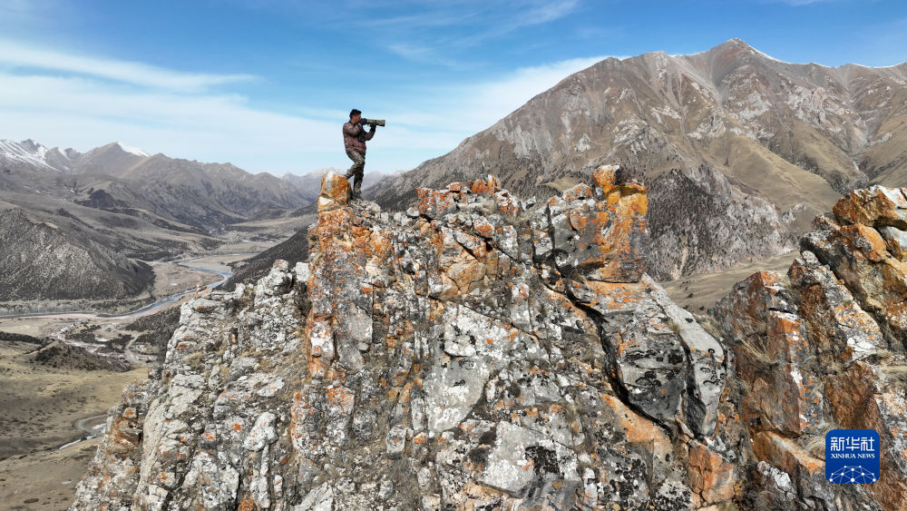2月22日,更求曲朋在昂賽大峽谷里巡護(hù)途中拍照(無(wú)人機(jī)照片)。新華社記者 張宏祥 攝