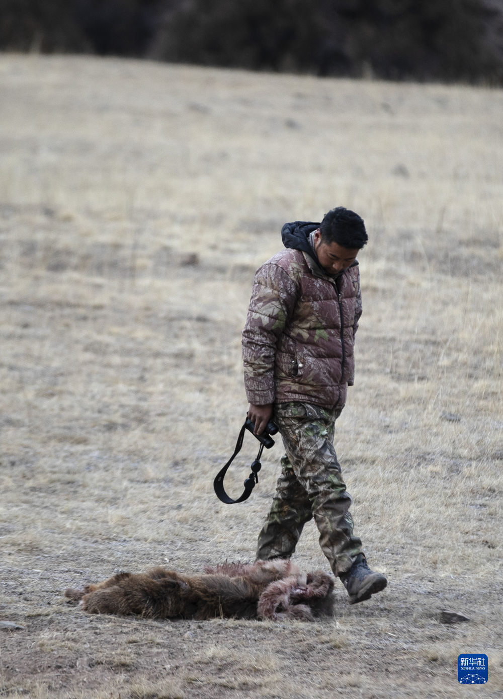 2月21日,更求曲朋在昂賽大峽谷里查看一只被獵殺不久的白唇鹿。新華社記者 費(fèi)茂華 攝