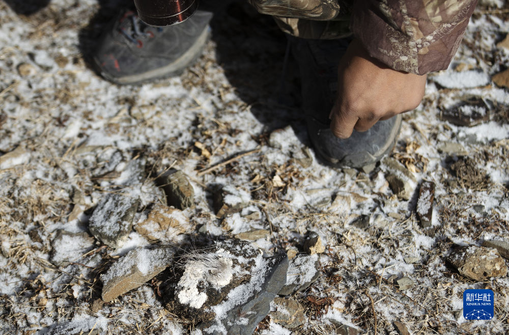 2月21日,更求曲朋在昂賽大峽谷里巡護(hù)時(shí)查看巖羊留下的毛發(fā)。新華社記者 費(fèi)茂華 攝