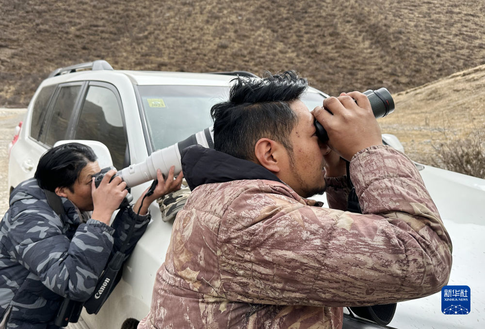 2月21日,更求曲朋(右)和才仁尼瑪在昂賽大峽谷里觀(guān)察遠(yuǎn)處的雪豹。新華社記者 費(fèi)茂華 攝