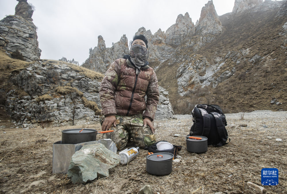 2月21日,更求曲朋在昂賽大峽谷里一邊做飯,一邊查看遠(yuǎn)處山上的情況。新華社記者 費(fèi)茂華 攝