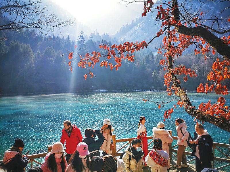 2月14日,來自遼寧的游客郭婷和男友在九寨溝風(fēng)景名勝區(qū)的五花海棧橋上拍了一組照片發(fā)在朋友圈,并配上文字:“兔年第一站,打卡九寨溝。”
