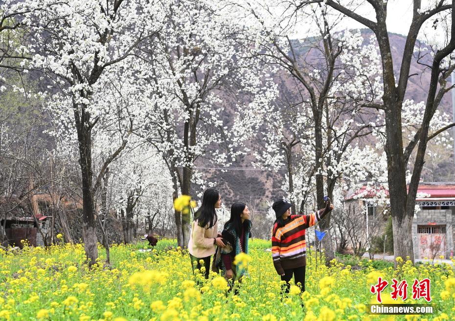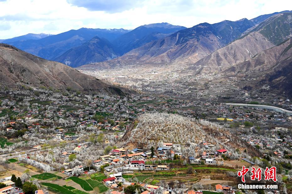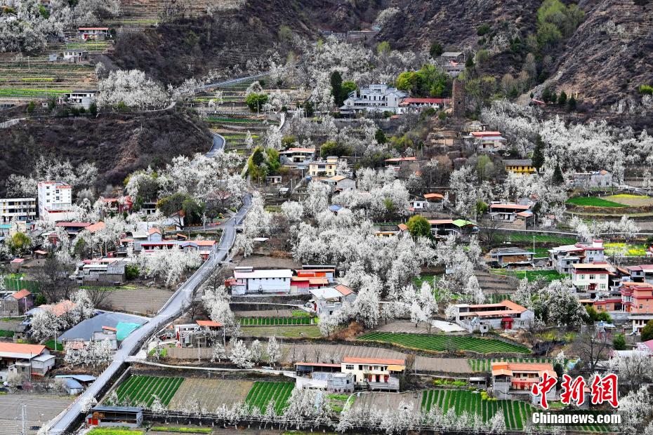 圖為梨花叢中的村寨。安源 攝