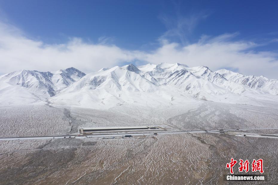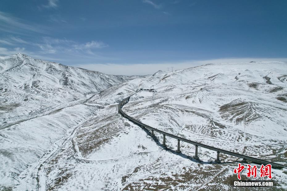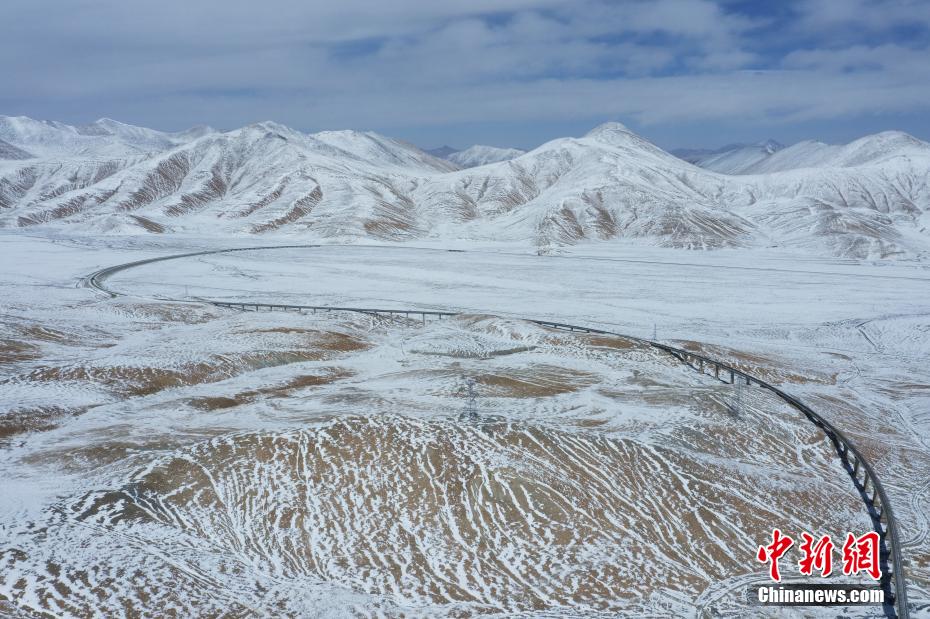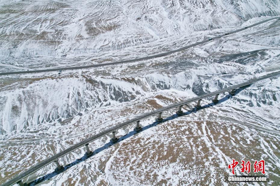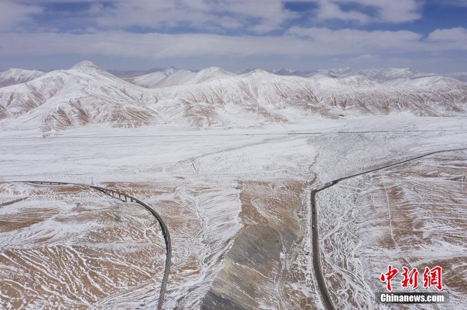 3月25日,航拍位于青海省海西蒙古族藏族自治州境內(nèi)的昆侖山。一場(chǎng)春雪過后,青海省海西州境內(nèi)的昆侖山銀裝素裹,青藏鐵路和青藏公路并行其中,雄偉壯麗。