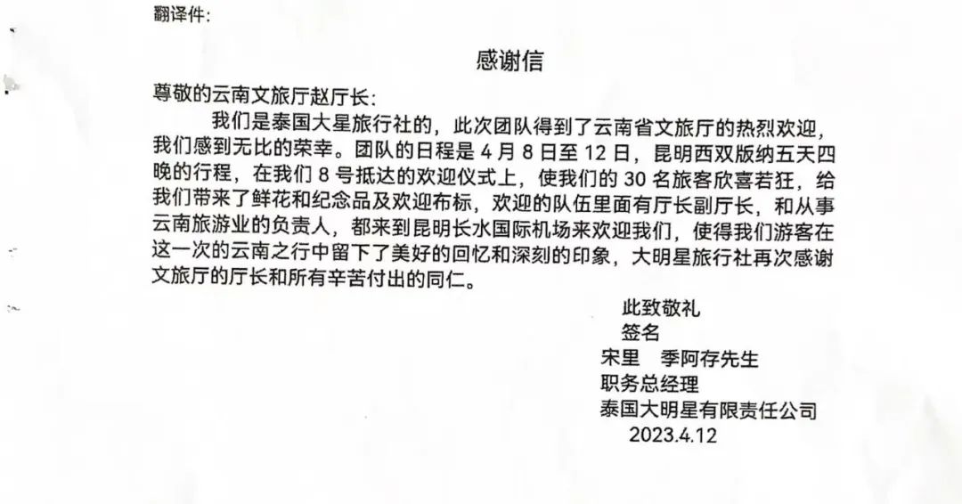 “在這四晚五天的云南之行中,我們無時無刻不心懷感激感恩之情,此次旅途給我們留下了深刻的印象。開心快樂一路相隨,云南的風(fēng)景美、人更美,一路上遇到的人,對待外國游客是多么的友善和可愛?!比涨?,一封寫有30位泰國游客名字的感謝信送到云南省文化和旅游廳,字里行間中透露著真摯情感和濃濃的感謝之意,傳遞著泰國游客對云南的喜愛,對云南之行的滿意……