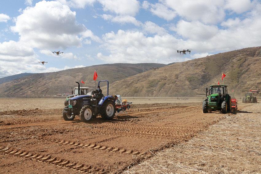圖為農(nóng)牧民使用現(xiàn)代化農(nóng)業(yè)機(jī)械設(shè)備進(jìn)行春耕