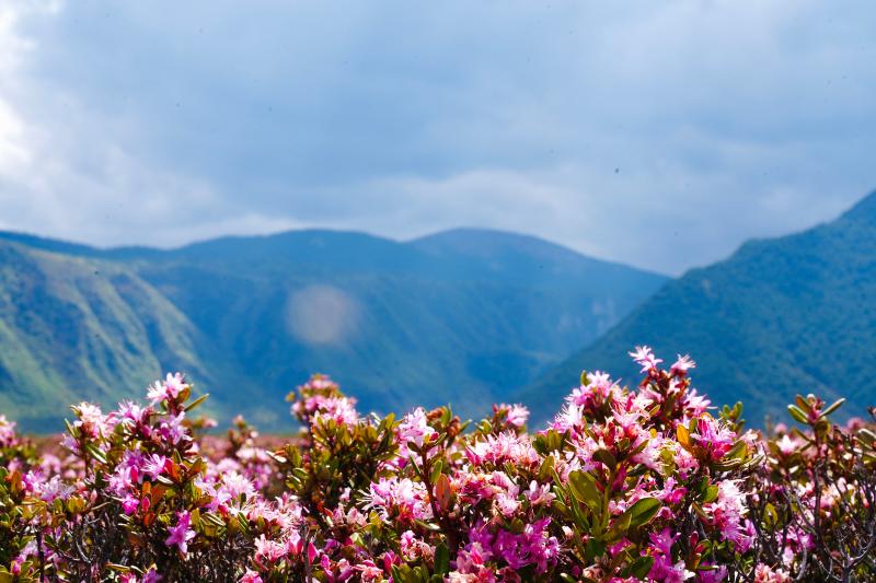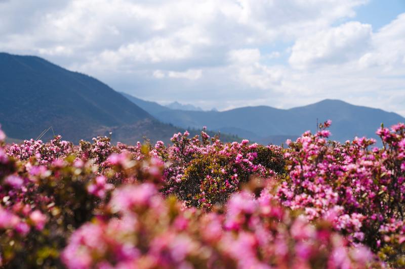 五月的香格里拉,是杜鵑花盛開的季節(jié)。建塘鎮(zhèn)稱尼壩子上的粉色杜鵑開放,大片的杜鵑鋪滿了山腳下的壩子,仿佛給大地鋪上了粉色地毯。