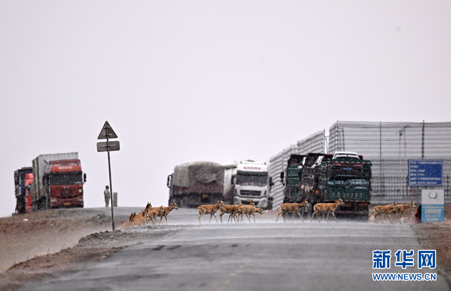 在青??煽晌骼铮蝗捍菩源a(chǎn)藏羚羊準備通過青藏公路。新華社記者 張宏祥 攝