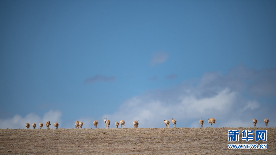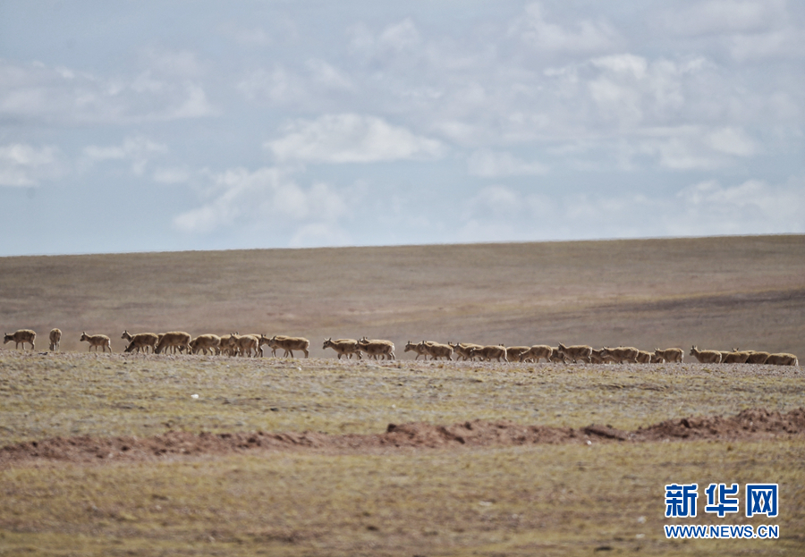 一群雌性待產(chǎn)藏羚羊在青海省玉樹藏族自治州境內(nèi)活動。新華網(wǎng) 潘彬彬 攝