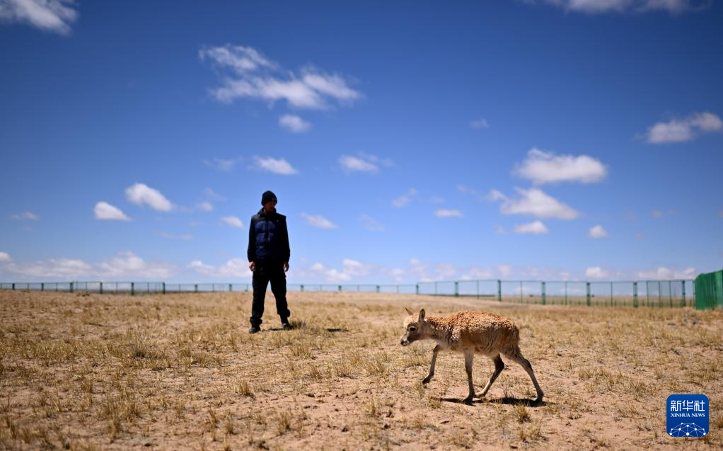 在可可西里國(guó)家級(jí)自然保護(hù)區(qū)索南達(dá)杰保護(hù)站,巡山隊(duì)員扎西桑周在野生動(dòng)物救助中心內(nèi)與一只被救助的小藏羚羊互動(dòng)(5月30日攝)?!⌒氯A社記者 張宏祥 攝