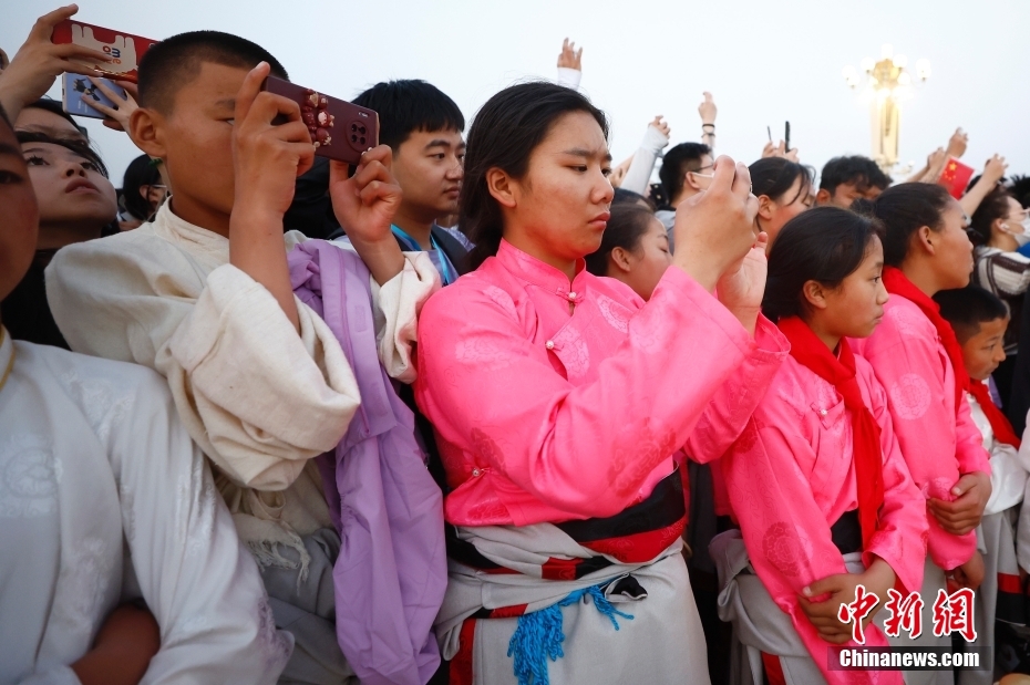 圖為觀看升旗儀式的藏族青少年們。中新社記者 富田 攝