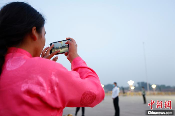 “六一”兒童節(jié)一早,來(lái)自青海省玉樹(shù)藏族自治州兒童福利院的部分藏族青少年在天安門(mén)廣場(chǎng)觀看升旗儀式。圖為鬧增拉毛在拍攝五星紅旗。中新社富田 攝