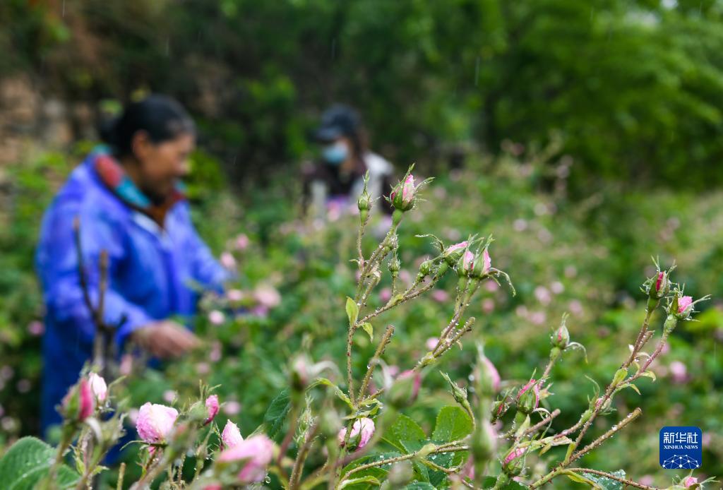 6月14日,在四川省阿壩州小金縣新橋鄉(xiāng)共和村,當?shù)胤N植戶在采摘玫瑰鮮花。新華社記者 王曦 攝