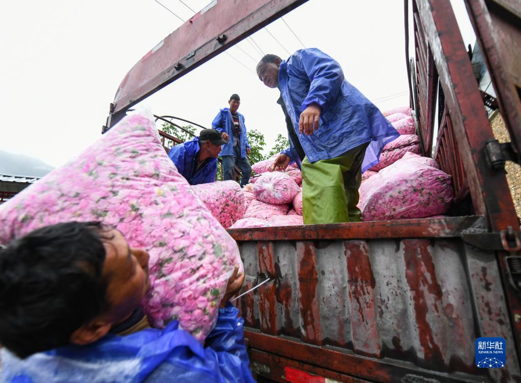 6月14日,在四川省阿壩州小金縣新橋鄉(xiāng)共和村,“金山玫瑰”基地的工作人員在收購當?shù)胤N植戶的玫瑰鮮花。新華社記者 王曦 攝