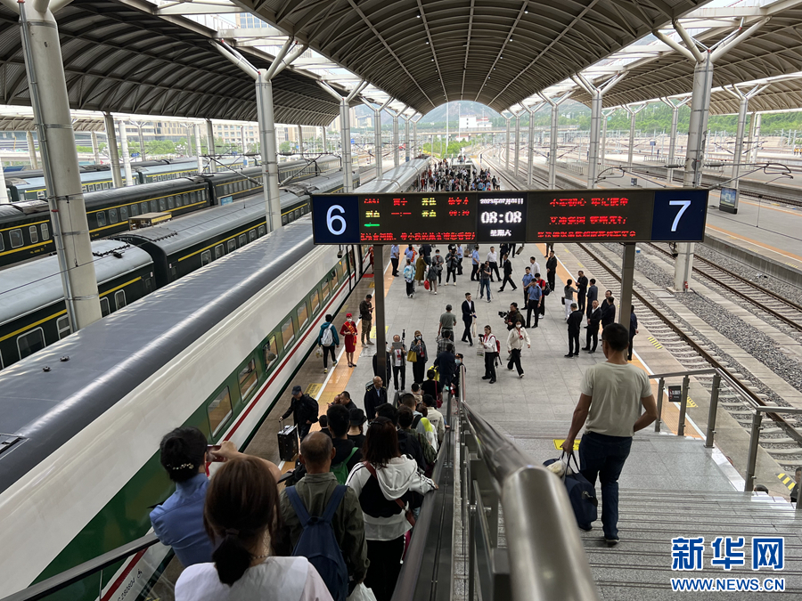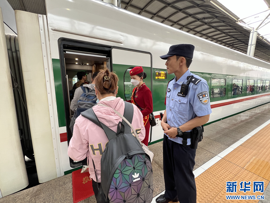 7月1日,工作人員在站臺上為出行旅客提供服務(wù)。新華網(wǎng) 魚昊 攝