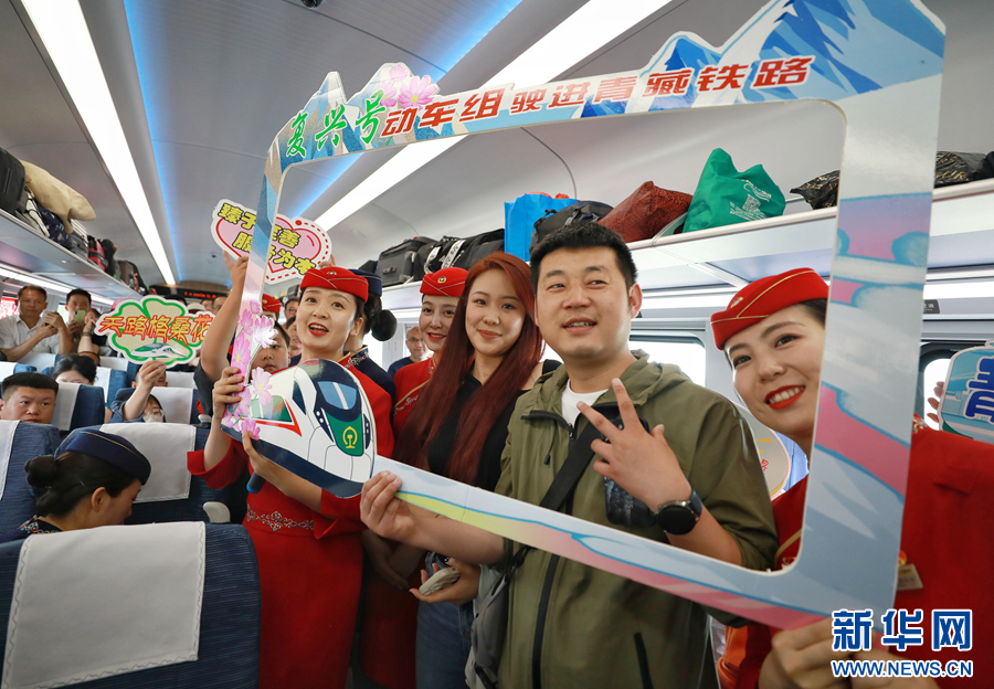 7月1日,在C891次西寧至格爾木動車組列車上,乘客與列車工作人員拍照互動。新華網(wǎng) 郝寶君 攝