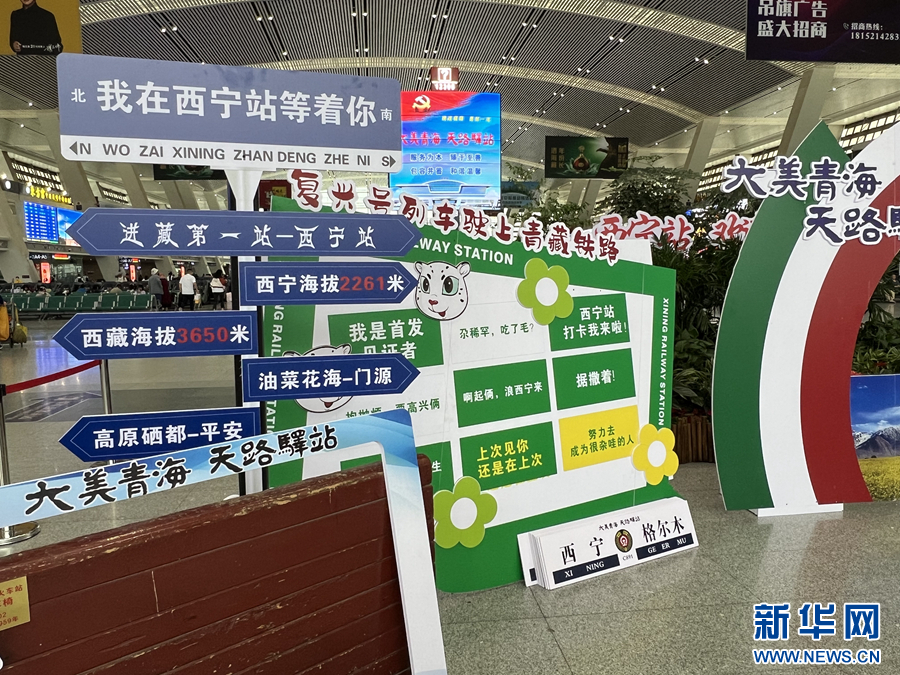 7月1日,在西寧火車站候車大廳,工作人員設(shè)置了拍照打卡點。新華網(wǎng) 魚昊 攝