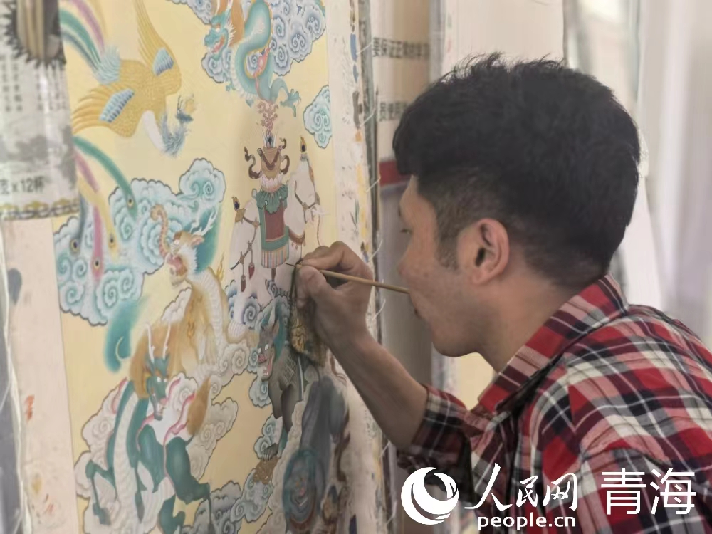 學(xué)徒細致描繪唐卡。人民網(wǎng) 馬可欣 攝
