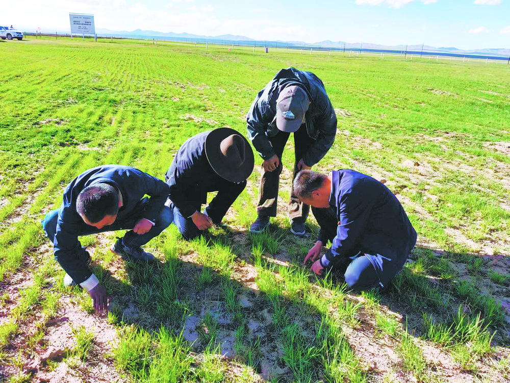 工作人員查看草原綠化情況。黃河源園區(qū)管委會供圖