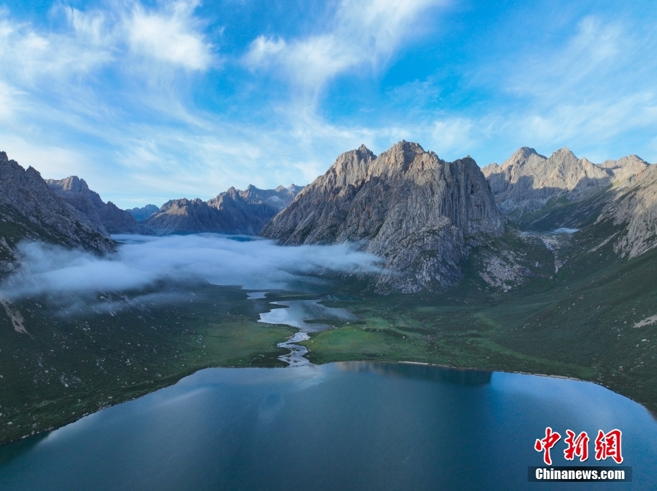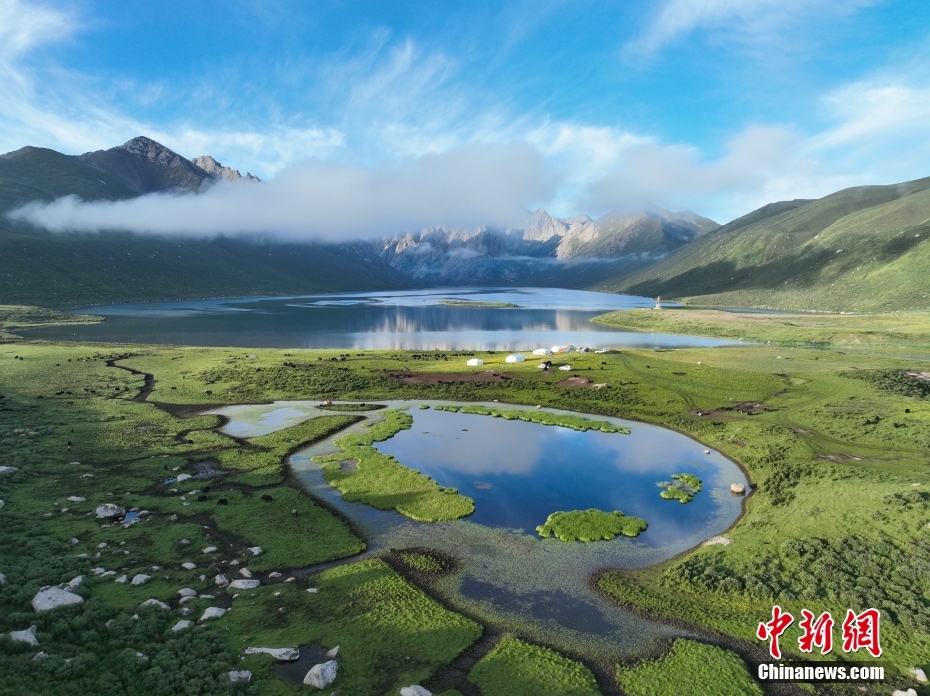 7月19日,盛夏時節(jié),青海省果洛藏族自治州久治縣年保玉則山間云霧繚繞,山下鮮花盛開,水清草豐,靜謐的湖水與嶙峋的山巒相映成趣,宛如仙境。年保玉則總面積3469平方公里,山形如蓮花,保存有冰蝕地貌、冰磧地貌、現(xiàn)代冰川等地質(zhì)遺跡。中新社記者 馬銘言 攝