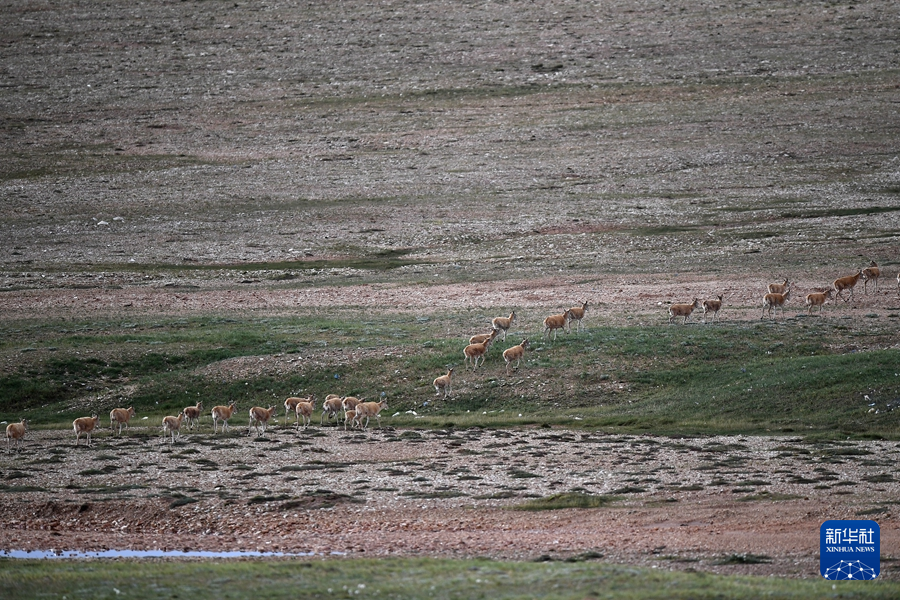 7月28日,一群藏羚羊在青藏公路附近活動。新華社記者 韓方方 攝