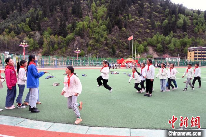 5月17日,四川阿壩州壤塘縣寄宿制學校的學生在操場跳繩。中新社記者 安源 攝