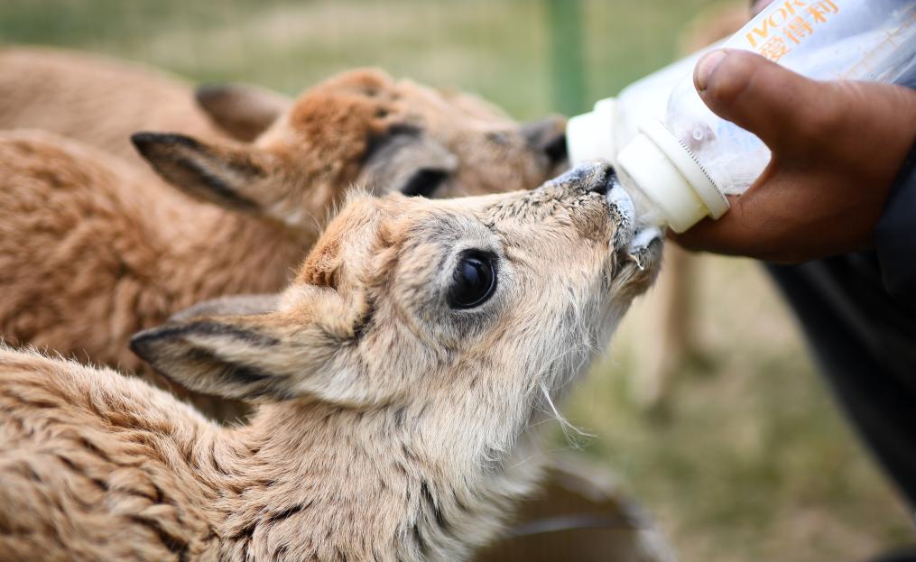 可可西里管理處索南達(dá)杰保護(hù)站隊員才仁多杰在給被救助的藏羚羊幼仔喂奶(7月28日攝)。新華社記者 張宏祥 攝
