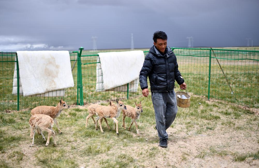可可西里管理處索南達(dá)杰保護(hù)站隊員才仁多杰和被救助的藏羚羊幼仔在一起(7月28日攝)。新華社記者 張宏祥 攝