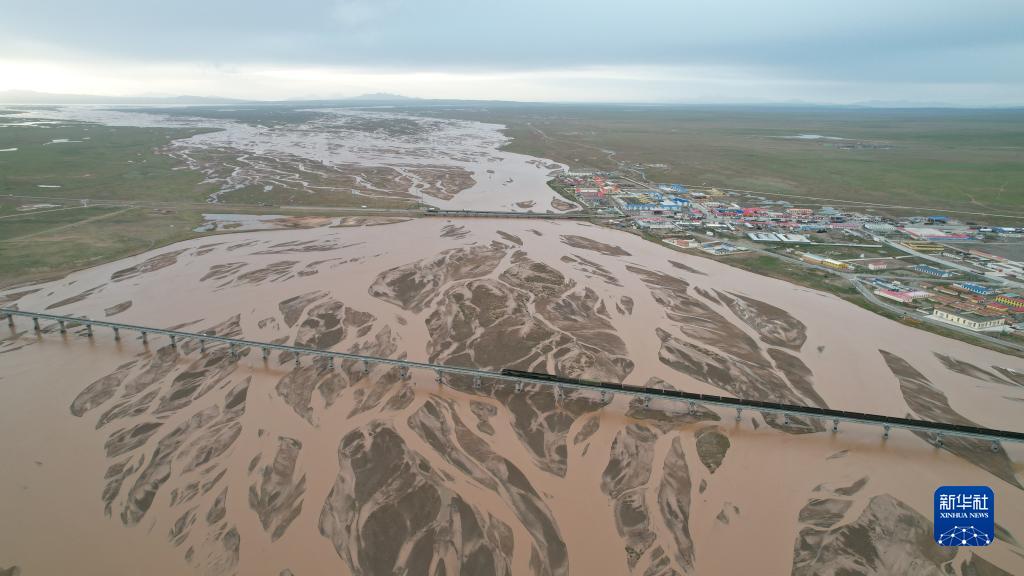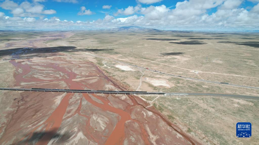 青藏鐵路列車通過楚瑪爾河(7月29日攝,無人機(jī)照片)。 新華社記者 劉詩平 攝