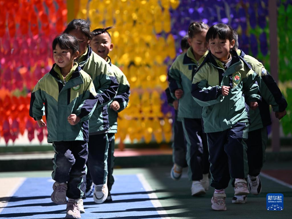 9月4日,青海省果洛藏族自治州瑪沁縣大武幼兒園小朋友在體育課上跑步。新華社記者 張龍 攝
