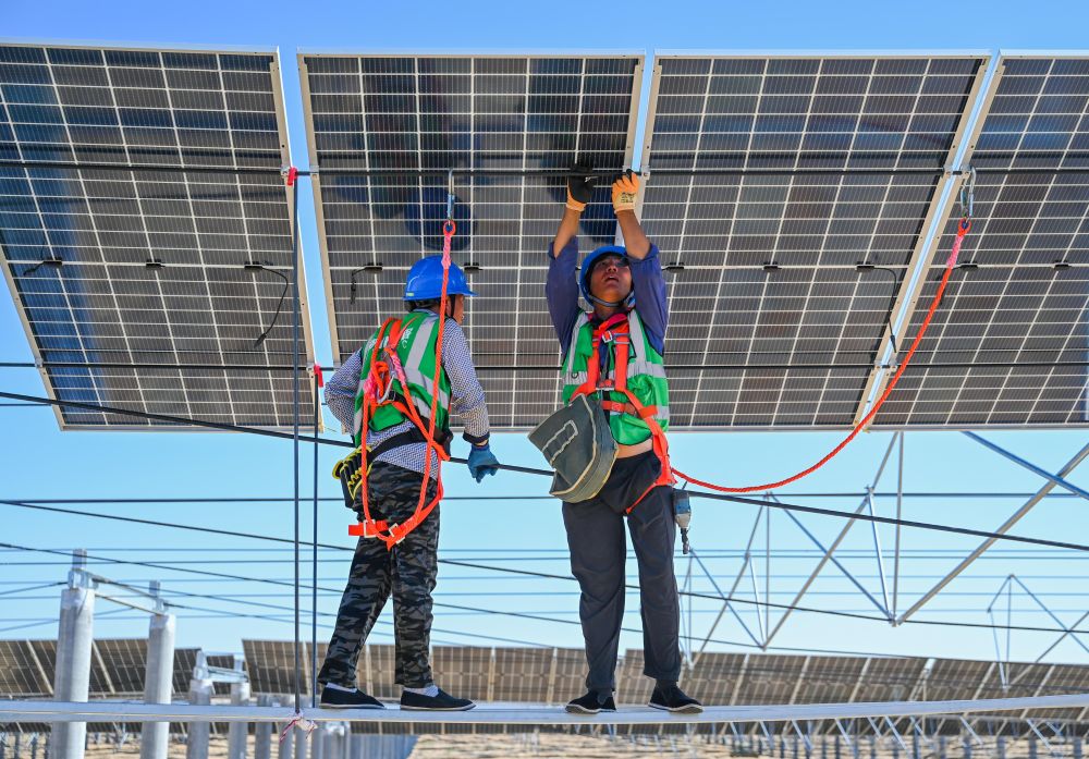 2023年7月22日,工人在位于內(nèi)蒙古杭錦旗庫布其沙漠億利生態(tài)示范區(qū)的蒙西基地庫布其200萬千瓦光伏治沙項目工地安裝光伏板。新華社記者 劉磊 攝