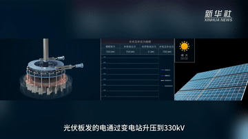 光伏板發(fā)的電通過變電站升壓到330KV,經過50多公里長的高壓輸電線路輸送到龍羊峽水電站,水電站再根據總的發(fā)電任務和光伏實時發(fā)電量調節(jié)水電,實現(xiàn)“削峰填谷”,最終并網向外輸送。