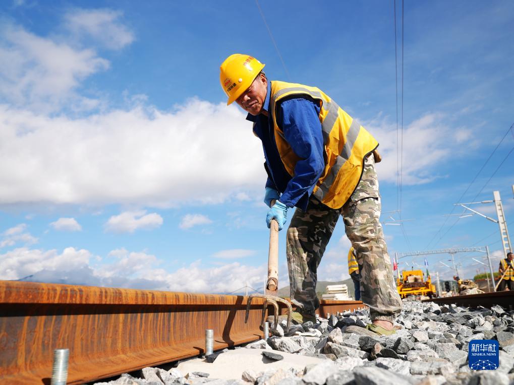 9月19日,施工人員在滇藏鐵路麗香段香格里拉站鋪軌。新華社 張偉明 攝